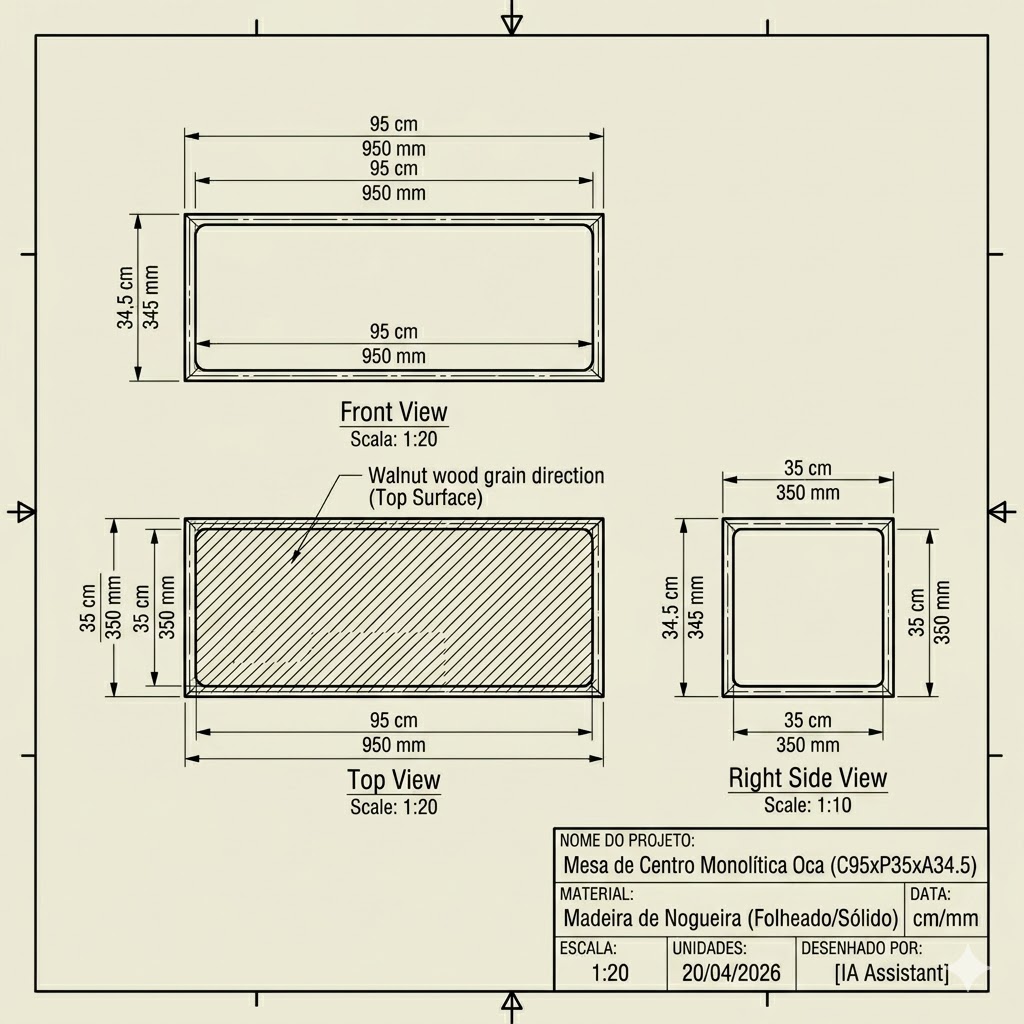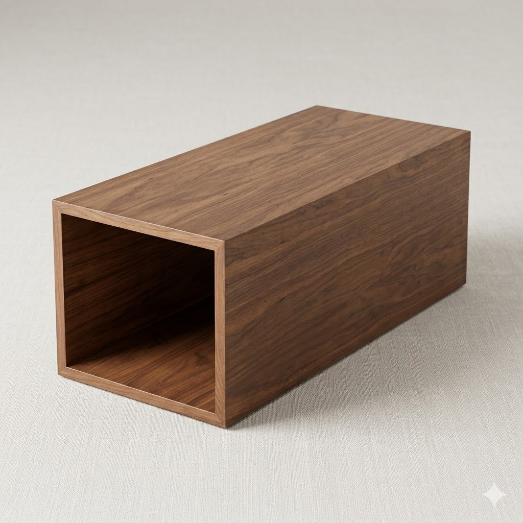 Esta mesa de apoio apresenta um design moderno e minimalista, caracterizado pela sua forma retangular e clean. É feita de madeira de nogueira com um acabamento suave, realçando a beleza natural dos veios da madeira. O seu design aberto e oco confere-lhe uma sensação de leveza e versatilidade, podendo ser utilizada de diversas formas e em diferentes divisões da casa.